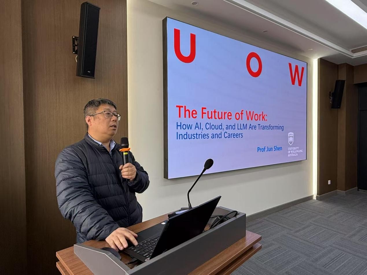 首先,沃隆港大学计算与信息技术学院沈俊教授系统回顾了深度学习与Transformer架构推动下的人工智能飞跃,阐述了大模型在预测生成、多模态应用等方面的突破。同时,他也指出了当前AI大模型在可解释性、数据安全、算力依赖等方面面临的挑战,并展望了其在智能制造、材料研发等领域的应用潜力,为AI赋能研发创新提供了思路。